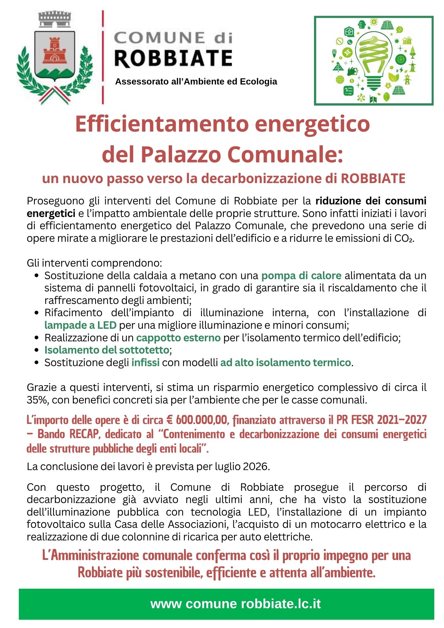 L'Amministrazione comunale conferma così il proprio impegno per una Robbiate più sostenibile, efficiente e attenta all'ambiente.