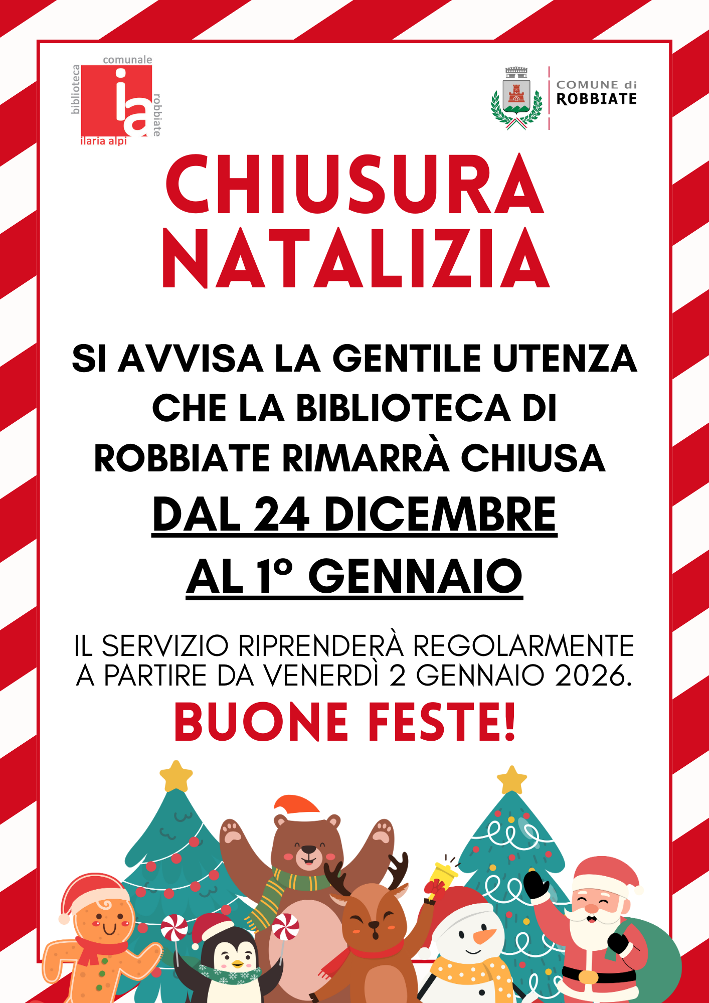 La biblioteca comunale Ilaria Alpi sarà chiusa da Mercoledì 24 dicembre  a giovedì 1 gennaio compreso.