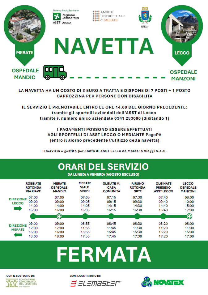 Il servizio è prenotabile entro le ore 14.00 del giorno precedente tramite gli sportelli aziendali dell'ASST di Lecco, tramite il numero unico aziendale 0341253000 (digitando 1).