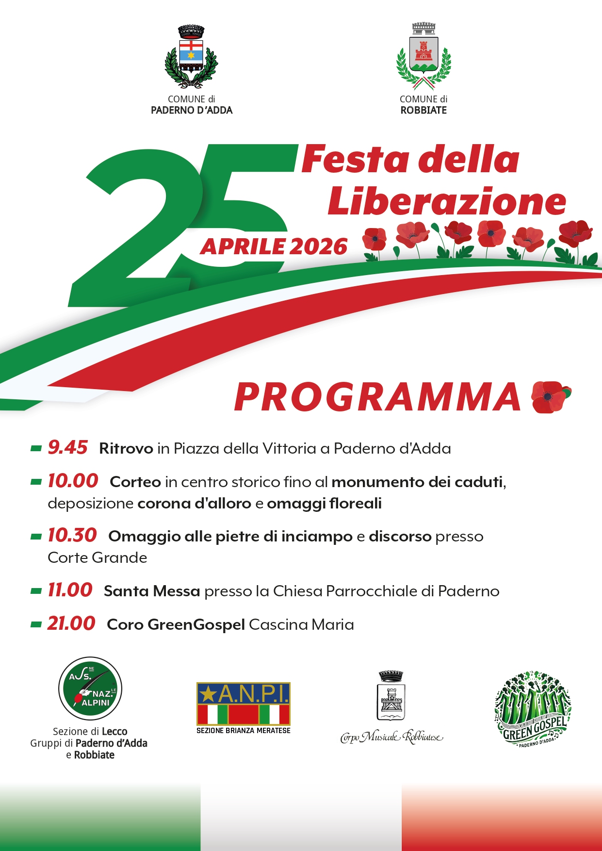 Celebrazione istituzionale congiunta tra i Comuni di Paderno d’Adda e Robbiate, con la partecipazione della sezione ANA di Lecco Gruppi di Paderno d’Adda e Robbiate, A.N.P.I., del Corpo Musicale Robbiatese e del coro Green Gospel.