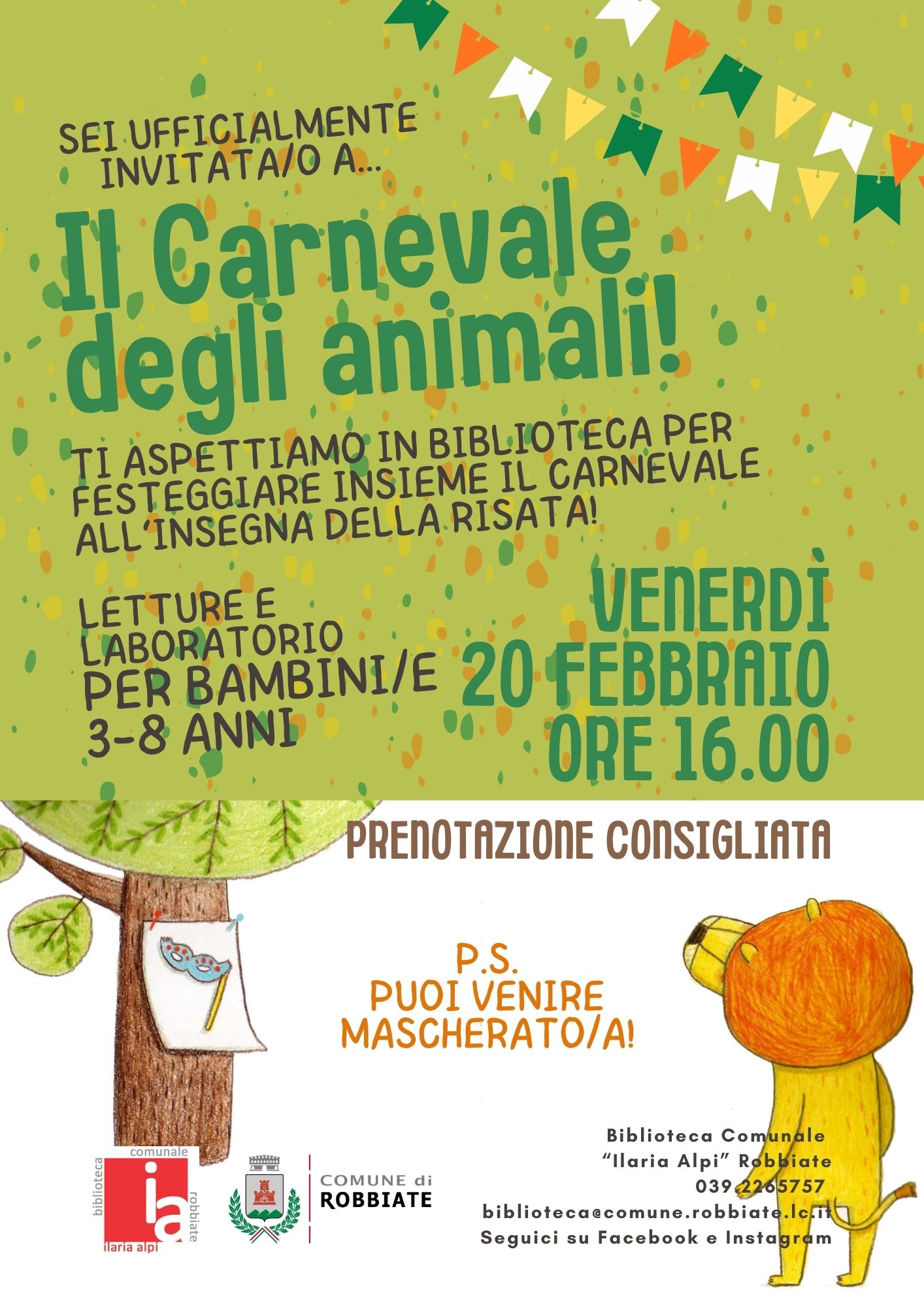 Ci saranno letture e un laboratorio di carnevale, età consigliata dai 3 agli 8 anni. Ricordiamo anche che si può venire mascherati.